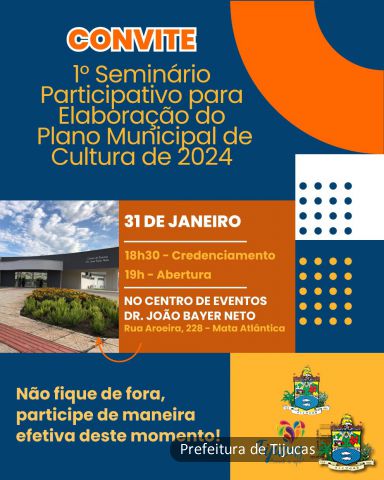 A Secretaria de Cultura, Juventude e Turismo de Tijucas, juntamente com o Conselho Municipal de Cultura, vai promover na próxima quarta-feira, dia 31 de janeiro, o 1° Seminário Participativo para a Elaboração do Plano Municipal de Cultura. O evento também conta com a parceria do SEBRAE de Santa Catarina através do Programa Cidade Empreendedora.