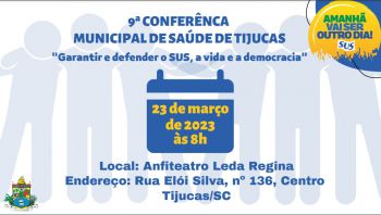 Com o tema “Garantir e defender o SUS, a vida e a democracia”, acontece no dia 23 de março, uma quinta-feira, a 9ª Conferência Municipal de Saúde de Tijucas. O encontro será realizado no Anfiteatro Leda Regina de Souza, das 8h às 17h, com intervalo para almoço.