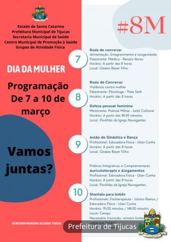 Os grupos de atividades físicas da secretaria municipal de Saúde de Tijucas estão com uma programação especial durante esta semana em homenagem ao Dia Internacional da Mulher, comemorado no dia 8 de março.