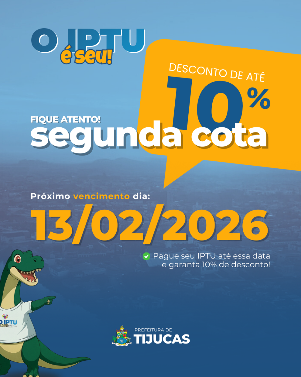 A Prefeitura de Tijucas orienta os contribuintes a ficarem atentos ao prazo para pagamento do IPTU 2026. A segunda cota, assim como a opção de pagamento à vista com desconto, vence no dia 13 de fevereiro. Os boletos podem ser emitidos preferencialmente de forma on-line, por meio do site oficial do Município, ou retirados presencialmente na Prefeitura de Tijucas.