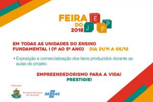 O Programa Jovens Empreendedores Primeiros Passos (JEPP) é um projeto idealizado pelo SEBRAE, desenvolvido nas escolas da Rede Municipal em parceria com a Secretaria Municipal de Educação. Para encerrar os trabalhos deste ano, a Feira do JEPP vai exibir e comercializar os itens produzidos pelos alunos durante as aulas do projeto. A programação acontece em todas as unidades escolares do Ensino Fundamental I, entre os dias 21 de novembro e 05 de dezembro.